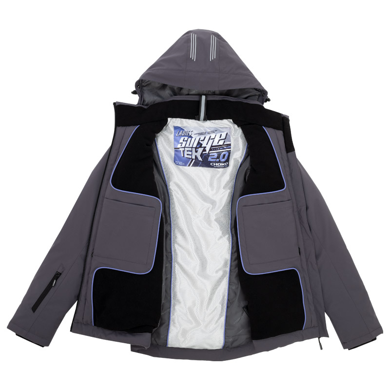 *94% Polyester/6% Spandex, three-layer bonded waterproof/breathable shell *Thinsulate™ insulation, 7 oz. in the body, 5 oz. in the sleeve *Reflective accents & decoration *Heat retention lining *Interior storm flap *Removable, adjustable hood *Two exterior zippered pockets & one sleeve pocket *Interior pocket *Reflective print center front zipper & sleeves *Adjustable bottom hem security pocket *One interior media pocket *Comfort tricot lined collar *Sport cuff with thumb hole *YKK® center front zipper *Flattering fit